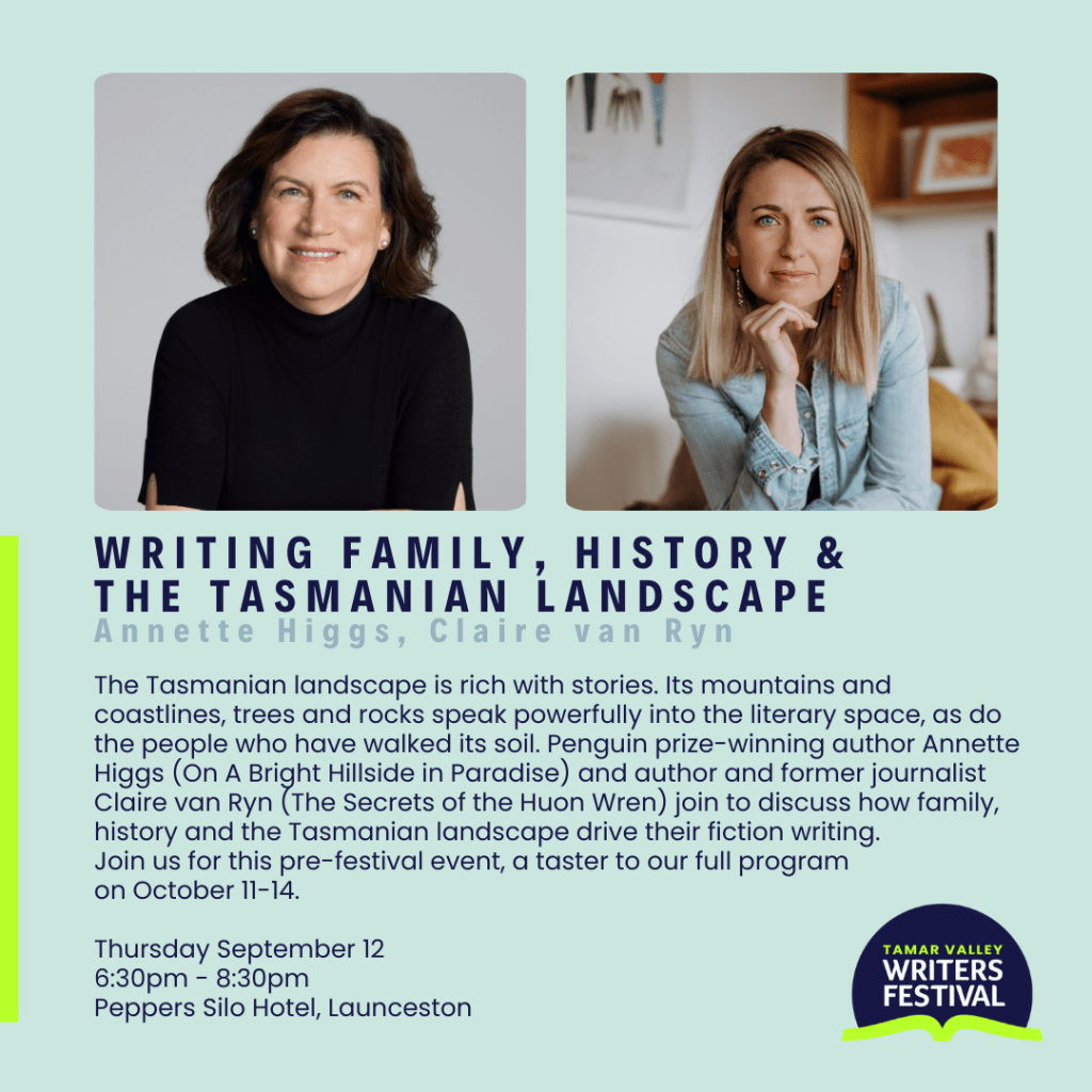 On September 12 at Peppers Silo Hotel in Launceston, I will be joining Penguin Prize-winning author Annette Higgs for a conversation titled: Writing Family, History and the Tasmanian Landscape. Hosted by the Tamar Valley Writers Festival, this is a warm-up event to the flagship weekend in October.